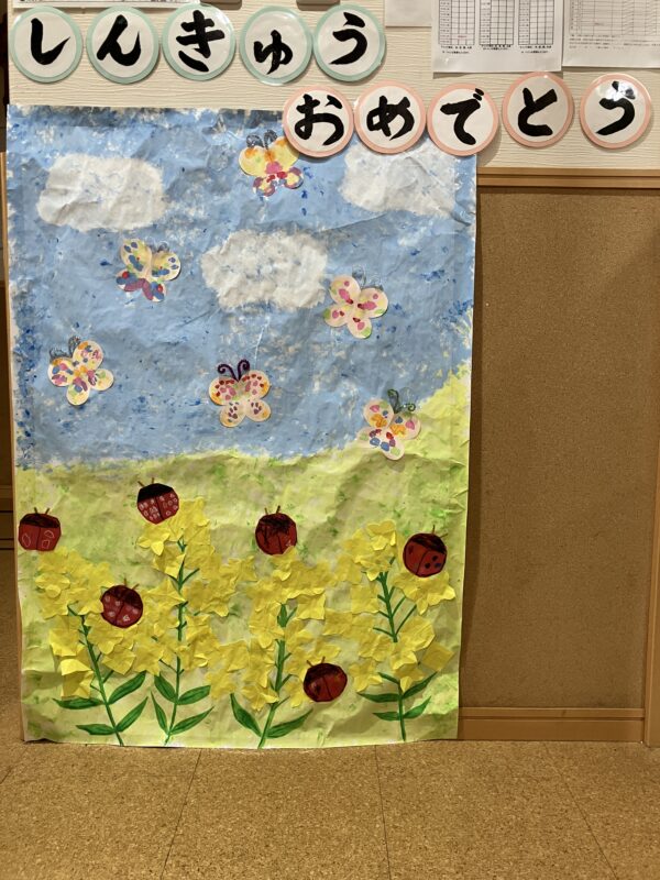 玄関前には菜の花の制作が飾ってあります!外からも少し見えると思うのでぜひご覧ください👀