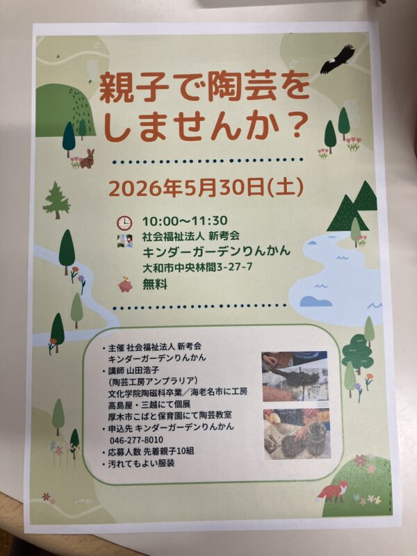 保育ブログblog 2026.4.1 陶芸教室のお知らせ 毎年秋に行われていた子育て支援講座の陶芸教室ですが、今年はなんと春🌸に開催します! 先着親子10組様なのでお早めにご応募ください❣❣ いつも皆さん夢中になってお皿やコップ、手形を取ってみたり✋世界に一つだけの宝物ができます☆ ぜひ体験してみてください! 前の記事 一覧に戻る